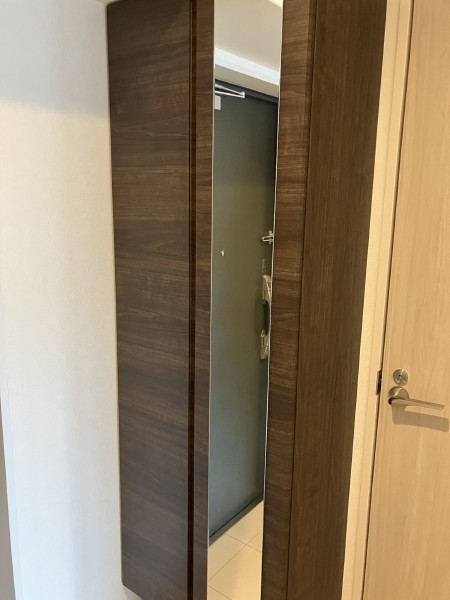 使いやすさの工夫が詰まったスタイリッシュなシャワー付洗面台は、ナチュラルな光沢木目柄の扉に便利な3面鏡仕様です。